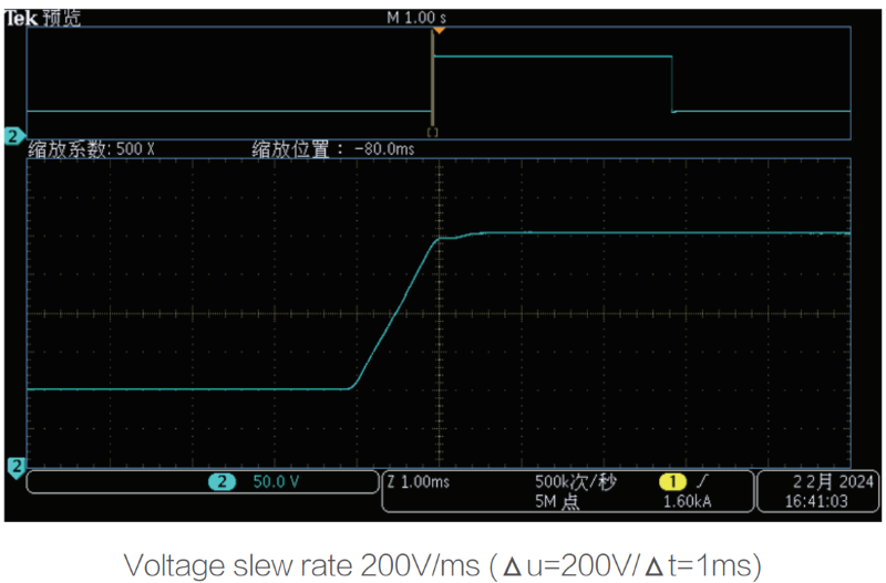 The voltage is instantly loaded from 0 to 90% Pe, and the voltage recovery time is less than 2 ms (using a silicon carbide design combined with a staggered BUCK topology design, and the control loop adjustment frequency is doubled to achieve high dynamic characteristics).