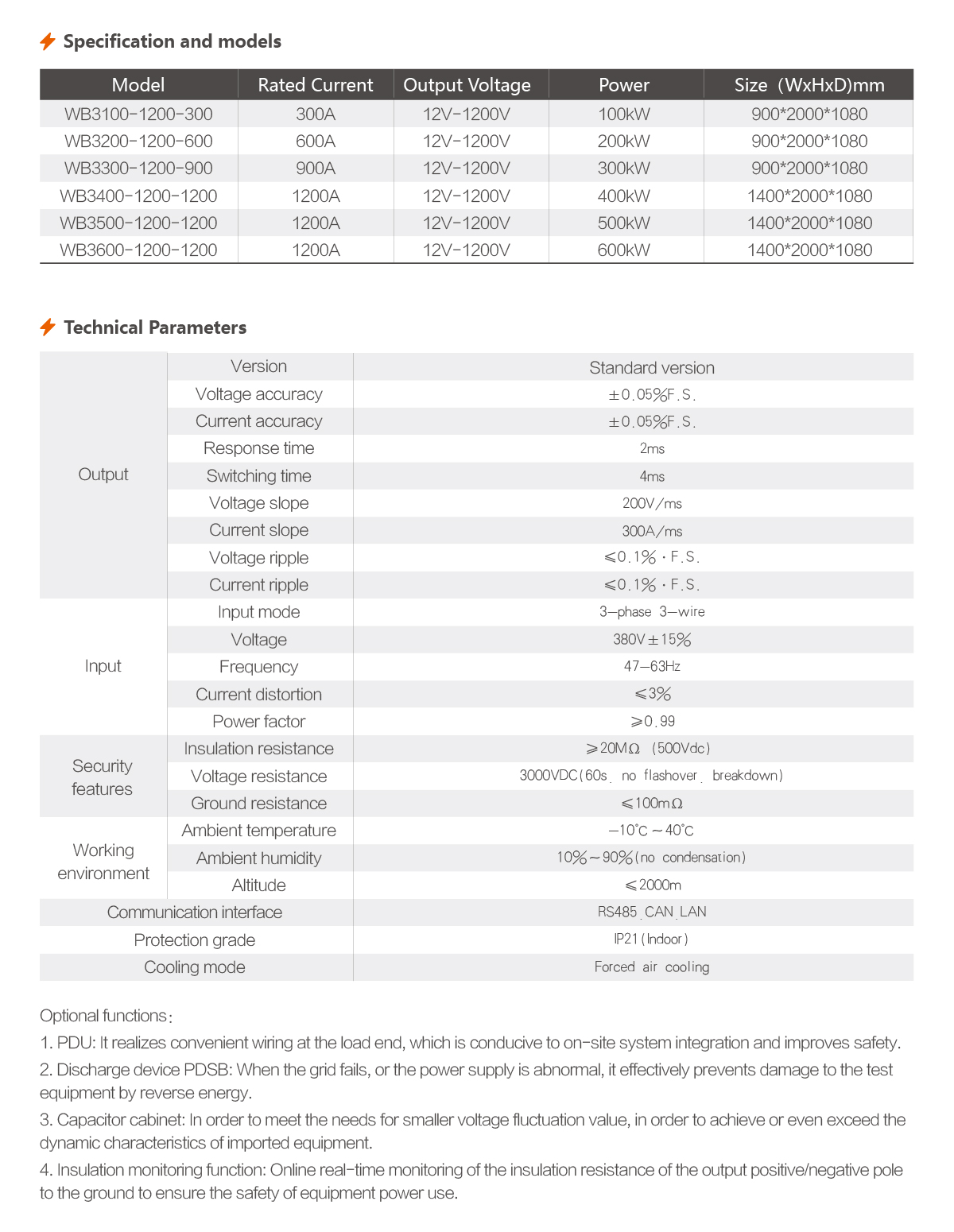 Voltage 12~1200V, Current 0~1200A, Power 0~600kW