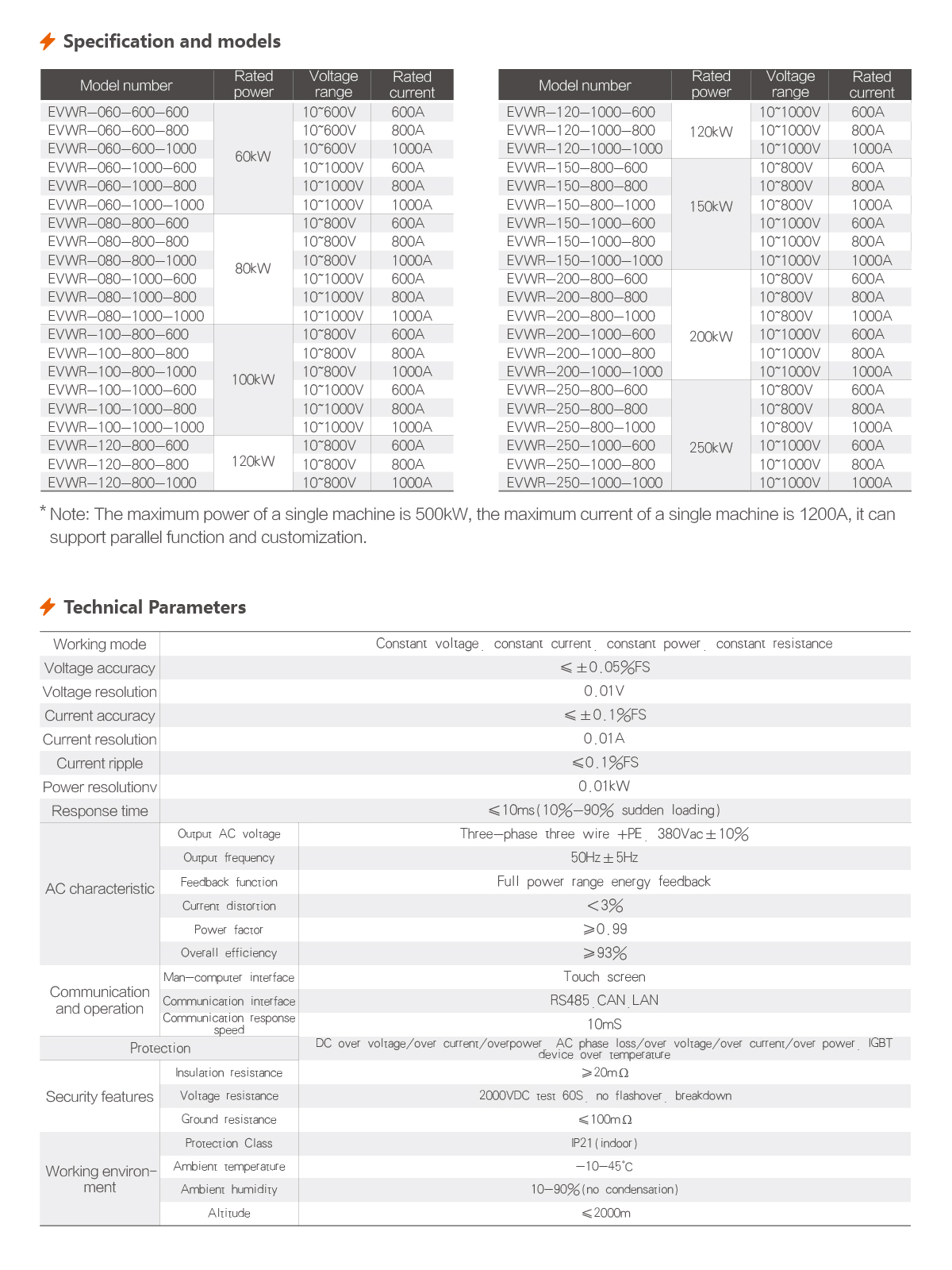 EVWR series regenerative electronic loads are specially developed for fuel cell engine testing, fuel cell DCDC testing, charging pile aging testing, etc. Core technologies such as four- quadrant PWM rectification, bidirectional BUCK conversion, and pure digital control are used to develop 100% energy feedback, high precision, rapid transient characteristics, high conversion efficiency, low pollution to the electrical grid, rich communication interfaces, and robust protection functions.