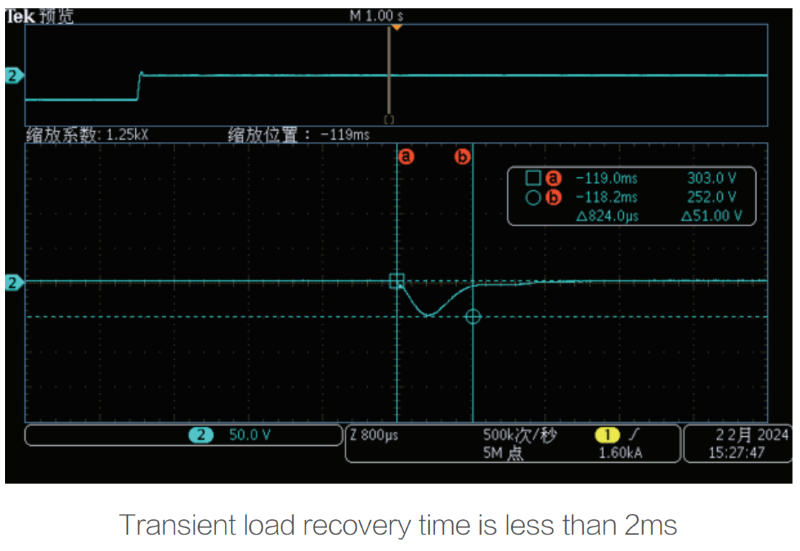 The voltage is instantly loaded from 0 to 90% Pe, and the voltage recovery time is less than 2 ms (using a silicon carbide design combined with a staggered BUCK topology design, and the control loop adjustment frequency is doubled to achieve high dynamic characteristics).